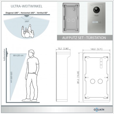 Die modulare Goliath Türstation ist mit einem eloxierten Aluminiumgehäuse ausgestattet und verfügt über ein Kamera Modul mit Full-HD und 180° Ultra-Weitwinkelobjektiv. Zusätzlich verfügt das Modul über echte Infrarot Nachtsicht. Ein Anschluss für die Türöffner-Funktion ist auf der Rückseite der Türstation vorhanden.