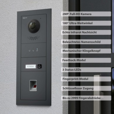 Die modulare Goliath Türstation ist mit einem eloxierten Aluminiumgehäuse ausgestattet und verfügt über ein Kamera Modul mit Full-HD und 180° Ultra-Weitwinkelobjektiv. Zusätzlich verfügt das Modul über echte Infrarot Nachtsicht. Ein Anschluss für die Türöffner-Funktion ist auf der Rückseite der Türstation vorhanden.